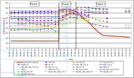 Water levels in the open-pit mine and groundwater levels from April 2013 to December 2015.