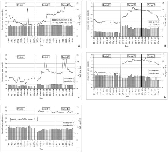 Histograms and water level plots of some of the wells of the Kalenić source from 21 November 2013 to 15 January 2015: (A) Obc-OE-165 (B-2); (B) OBp-2; (C) Bp-1; (D) BL6-1; (E) BL6-2.