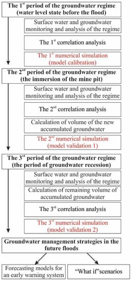The developed methodology is presented in the operational algorithm of the exploration (Figure 8). It is based on the creation of a groundwater model (GWM) and a fate and transport model (FTM), though an FTM was not created in this paper due to a lack of data. A basic model is created and calibrated for groundwater states that existed prior to the floods (in the defined example and the flooding of the open-pit mine). In the conditions in which the flood wave occurred, an evaluation of the realized hydraulic link between surface and groundwater is made based on surface and groundwater level monitoring, the volume of the ‘new’ groundwater as a consequence of floodwater inflow is determined, chemical analyses are performed on samples of groundwater and the first verification of the created models is done (on the level of groundwater and the balance or concentration of certain parameters of groundwater chemical composition). The second (control) verification of the model corresponds to the period of surface water level decrease (in the defined example of open-pit mine dewatering). It is preceded by identical actions as with the first verification of the model. A doubly verified model (or models) enables appropriately reliable prognostic calculation of the effects of new floods on the groundwater level regime of a certain area and makes it possible to adopt a strategy for groundwater management in a certain area for future floods.