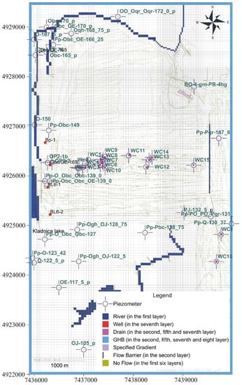 A head-dependent flux boundary condition (Cauchy’s or mixed boundary condition) and a prescribed flux boundary (Neumann boundary condition) were used in the model (Figure 9 and Figure 10). The head-dependent flux boundary served to simulate the impact of surface water–the Kolubara River, the Kladnica retention and other retentions (Layer 1), leakage from the aquifers along the working benches of the open-pit mine (Layers 2 and 5), and the operation of water collectors on the bottom of the coal benches (Figure 5). In the ModFlow code, the simulation was performed using the river (or drain) boundary condition. By specifying head-dependent flux boundary conditions, the model simulated groundwater inflow into and outflow from the model (Layers 2, 5, 7 and 8). This was represented by a general head boundary (GHB).