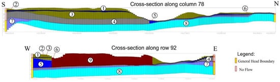 Schematic representation of the lithological section in the north–south (columns) and west–east (rows) directions. Key: 1. Clay sediments (Q); 2. Upper aquifer sands and gravel (Pl1) 3. Aleurite sediments (Pl1); 4. First coal bed (Pl1); 5. Intermediate aquifer sands (Pl1); 6. Second coal bed (Pl1) 7. Lower aquifer of high hydraulic conductivity (Pl1); 8. Lower aquifer sands of lower hydraulic conductivity (Pl1); and 9. Heterogeneous material at waste disposal site.