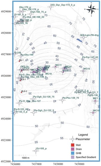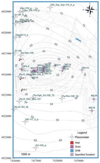 It is apparent in Figure 11 that the general direction of groundwater flow in the lower aquifer was from the north and northeast to the south of the study area. As a result of operation of the mine dewatering system (18 water collectors), the largest drawdown occurred in the central part of the model, where the water collectors are installed. Additionally, there were local drawdowns within the zones of the wells of the Kalenić source.