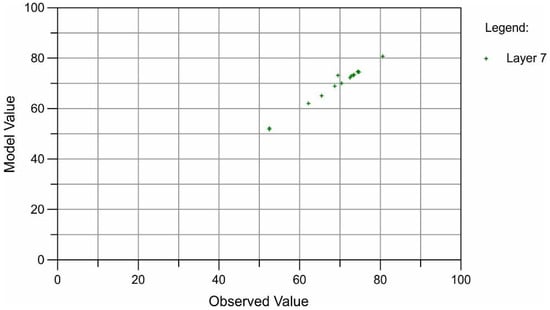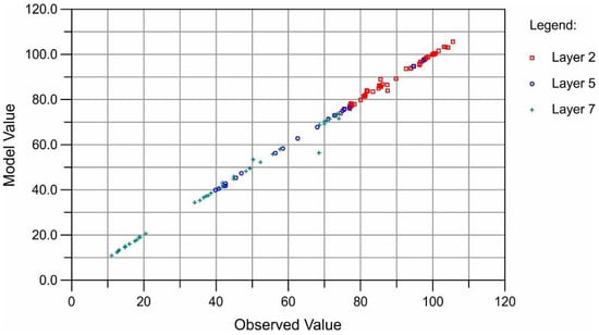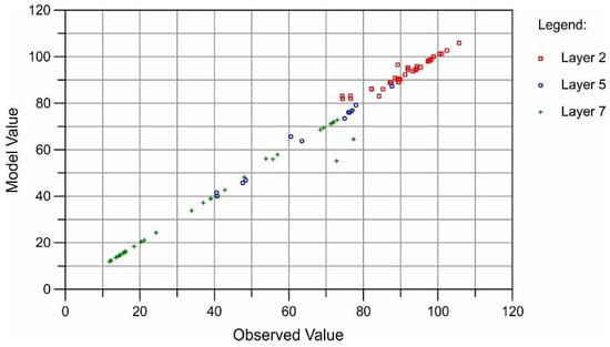 The operating wells (at the Kalenić source) in the western part of Tamnava–West Field (Layers 2 and 7 in Figure 10) were assigned a “prescribed flux” boundary condition. With this type of boundary condition, the case of no flow was also specified (q = 0), i.e., selected cells were designated as “no-flow” cells in the ModFlow code. Under natural conditions, these zones are virtually impermeable (all boundary contours of the modeled layers comprised of semipermeable lithological units–Layers 1, 2, 3, 4, 5 and 6). The impermeable screen located in the western part of Tamnava–West Field, near the Kladnica retention, was simulated with a prescribed flux boundary condition (Neumann boundary condition), i.e., a flow barrier in the ModFlow code (Layer 2). Recharge was simulated by selecting a prescribed flux boundary condition in the first model layer only. This created an influx as the difference between total recharge and evapotranspiration.