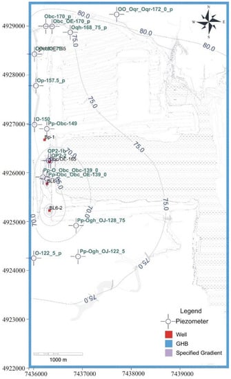 Figure 13 shows the piezometric head distribution of the lower aquifer at the end of the study period (September 2014). Compared to the situation during the first period, it is evident that there was a groundwater mound. Due to flooding of the mine and dewatering system, the only structures that affected the groundwater were the wells of the Kalenić source, which lowered the water table along the western contour. The presence of a lake above the underlying sands and the active hydraulic link between the aquifers in them with the flood lake, caused the groundwater level to rise above the elevation of 75 m a.s.l. in a large part of the lower aquifer.