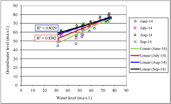 The correlation between the water level of the flood lake and the groundwater level of the lower aquifer was analyzed for this period (Figure 15). The conclusion was that an active hydraulic link had been established between the flood lake and the lower aquifer, with an excellent Pearson correlation coefficient, from 0.896 (minimum value in August 2014) to 0.916 (maximum value in July 2014). Values of coefficient of determination range from 0.8029 (minimum in August 2014) to 0.8382 (maximum in July 2014).