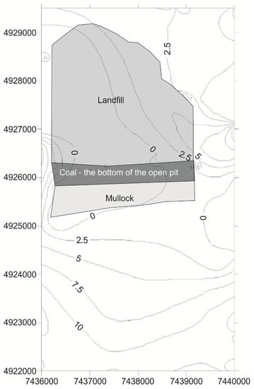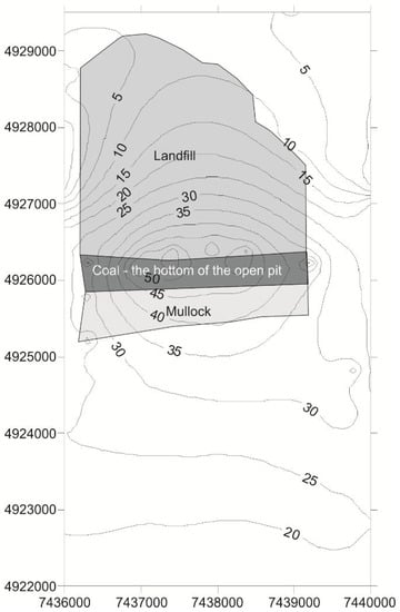 The lower aquifer at Tamnava–West Field is comprised of Late Pontian quartz sands. These sands span nearly the entire Kolubara Coal Basin. They are relatively homogeneous at Tamnava–West Field. Two zones can be distinguished along the vertical: the top layer is 20–30 m thick and comprised of coarse sand, with a hydraulic conductivity of (3–4) × 10−5 m/s, whereas the bottom layer is 70–80 m thick and the hydraulic conductivity is (1–2) × 10−5 m/s []. Their homogeneity and isotropy are only disturbed by coaly-clay interbeds. The floor is comprised of coal seams, followed by Miocene fine sand, silt and clay.