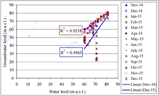 Figure 19 shows the correlation between the water level of the flood lake and the groundwater level of the lower aquifer in the third period. The Pearson correlation coefficient ranged from excellent (0.961 in November 2014) to good (0.704 in December 2015). The Pearson correlation coefficient in the final months of monitoring is lower due to fewer samples (fewer piezometers), but also because the groundwater mound decline “lagged” behind the decline in the water level of the flood lake. Values of coefficient of determination range from 0.4965 (minimum in November 2014) to 0.9238 (maximum in December 2014).
