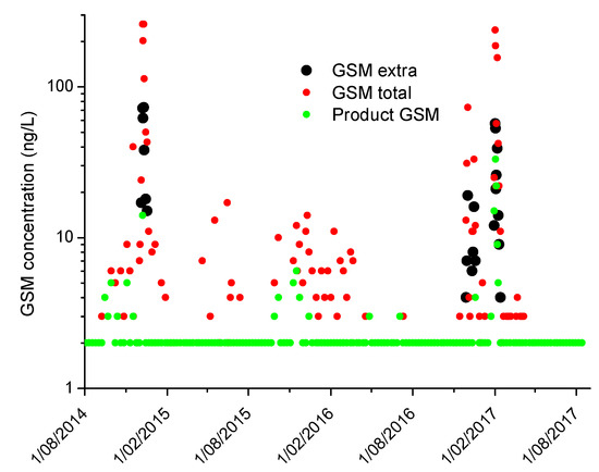Figure 1 shows the routine monitoring data for geosmin in the raw and product waters for a three year period in WTP-A [21]. Concentrations in the raw water can reach over 200 ng/L, with the concentration of dissolved geosmin less than 50% of the total. The ratio of dissolved and intracellular metabolites plays an important role in the performance of treatment processes [22,23,24,25,26,27]. Treated water geosmin concentrations rarely exceed the 10 ng/L goal; however, during the summer of 2016/2017, high concentrations of geosmin were breaking through the plant at times. These results help to identify the processes at the risk of metabolite breakthrough (Figure 1).