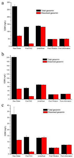 The total and dissolved geosmin concentration sampled at strategic points within the WTP-A: (a) on 1 February 2017, PAC dose = 30 mg/L; (b) on 3 February 2017, PAC dose = 30 mg/L; and (c) on 8 February 2017, PAC dose = 30 mg/L [21].