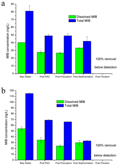 Investigative sampling was undertaken through the WTP-B in February and March 2015 [21]. The results are shown in Figure 3. The dissolved MIB removals by PAC are low due to the low contact time and relatively ineffective mixing. No further removal occurred from post-PAC to the end of sedimentation. For the three sampling days, intracellular MIB appeared to decrease during PAC treatment which may suggest a higher percent removal by PAC than indicated by the decrease in dissolved MIB alone. A lower than expected removal of intracellular MIB during coagulation and clarification was found on 24 February 2015 (80% compared with >95% for the other sampling days). On the three sampling days, the most effective unit process for dissolved MIB removal was the conventional rapid dual media filters which displayed removal below detection, indicating the use of PAC was not required. The sampling in WTP-A and WTP-B provide two complete examples of the audit process in full-scale water treatment plants to identify the critical treatment points.
