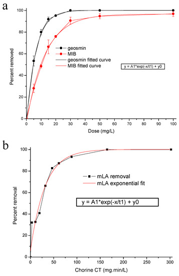 The experimental data and curve fitting for (a) MIB and geosmin removal by powdered activated carbon (PAC); (b) microcystin-LA removal by chlorine [21].
