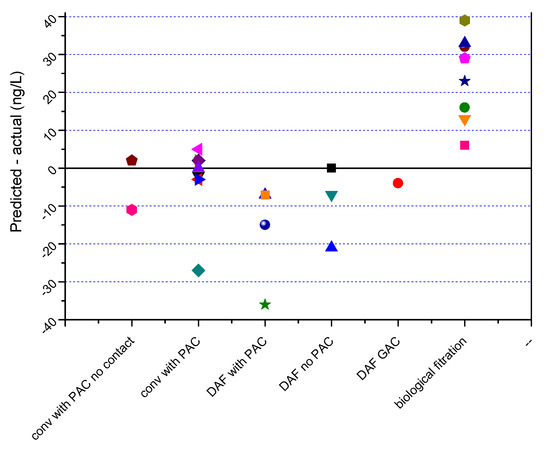 The representation of the difference between the measured metabolite concentrations in the treated water and the concentration predicted by the spreadsheet calculators [21].