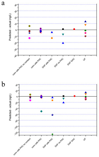 The representation of the difference between the measured metabolite concentrations in the treated water prior to filtration and the concentration predicted by the spreadsheet calculators at that point in the treatment train (a) with the same y-axis scale as Figure 5 and (b) with an expanded scale to show variations in the WTP-A samples [21].
