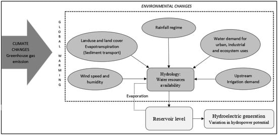 Several impacts of climate change on hydroelectric reservoirs can be considered: hydrological changes, variation in sediment load due to flooding, variation in volume and river flow due to changes in precipitation, and the occurrence of extreme events (e.g., droughts and floods) that can generate the need for dam design and safety improvements [,,,,,,].
