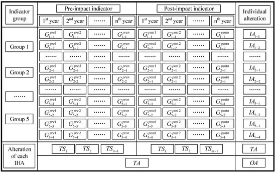 Previous research has assessed flow variability using over 170 hydrologic metrics describing ecologically relevant attributes of flow regime []. The last two decades have seen frequent use of the 32 Indicators of Hydrologic Alteration (IHA) hydrologic flow regime indices [], which can be classified via ecological relationships into five groups characterizing various aspects of flow: magnitude, frequency, duration, time, and rate of change (Table 1). The hydrologic alteration of each indicator between two defined time periods (i.e., pre-impact and post-impact periods) can be assessed efficiently using these indices, which greatly improves our understanding of the interactions between flow regimes and river ecosystems []. However, the IHA method, which is based on expert experience, reveals flow regime alteration in each of the 32 aspects of flow but provides no information about overall alteration []. To set river management targets for ecosystem restoration, Richter et al. [] proposed the range of variability approach (RVA), which computes the overall flow regime alteration based on the IHA method []. The RVA method uses a pre-impact flow series to establish the IHA target range [,] and divides each IHA into three tiers (the lower range, the target range, and the upper range). The target range spans the 25th to 75th percentiles of the pre-impact indicator values [,]. For each IHA, the frequency change between the pre- and post-impact period in the target range is the degree of alteration []. The RVA method uses the average alteration value for each IHA to evaluate the overall hydrologic alteration.