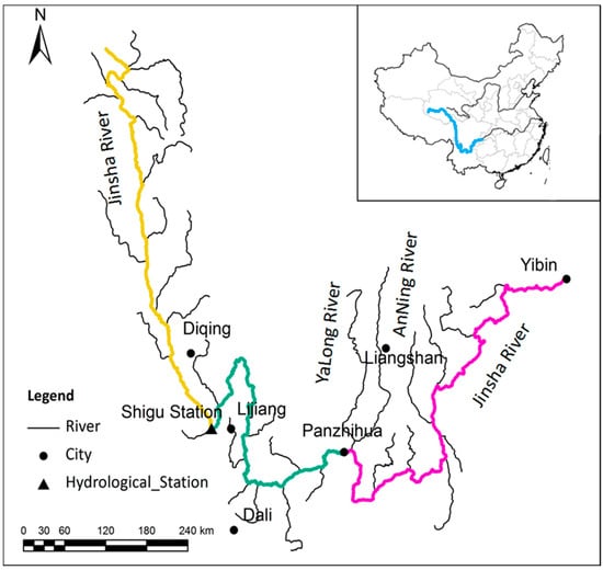 The Jinsha River, which is located in the upper reaches of the Yangtze River (Figure 3), has a total length of 2326 km; Jinsha River is generally divided into three sections: the upper (Yellow), the middle (Green), and the lower (Purple) Jinsha River. The Jinsha River mainstream begins in the eastern Geladan Snowy Mountain in the Tanggula Mountain range, from which snowmelt provides the main source of flow in the upper reaches. The population density is not large in the upper reaches of the Jinsha River, and there are no large hydraulic structures. Therefore, climate is the main factor inducing flow regime alteration in this region []. The upper reaches of the Jinsha River area have become warmer, with a mean temperature increase from 0.5 to 2 °C from 1993 to 2014 that has significantly altered the natural flow regime (Figure 4). The Shigu hydrological station is located in the junction of the upper and middle reaches of the Jinsha River. It has long flow data in Shigu hydrological station, which can facilitate us to verify the proposed method. In this study, the pre-impact series consists of daily flow data from 1971 to 1992, and the post-impact series consists of daily flow data from 1993 to 2014. Daily streamflow data during 1971–2014 for the Jinsha River mainstream were collected from the Shigu hydrological station.