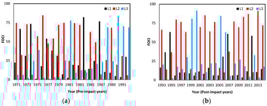 Based on Table 2, the number of IHA in three comparative intervals L1, L2, and L3 (L1 = (p0, p25), L2 = (p25, p75) and L3 = (p75, p100)) varies between years. For all years, the number of IHA is clearly higher in interval L2 than in the other two intervals. Furthermore, comparing the FOCI value in pre- and post-impact years (Figure 5), the FOCI values in interval L2 are almost always higher than those in the other two intervals. The change in FOCI values and numbers of IHA in each interval is consistent for most years, which indicates that the FOCI value effectively captures the characteristics of the 32 IHA within a given year. The change in IHA within each year is essential for determining particular flow regime characteristics and linking those characteristics to the aquatic ecosystem [,]. If only a few years are considered, the FOCI values and numbers of IHA become inconsistent, as the IHA reflect flow regime alterations jointly and the eco-response to each IHA is different [,]. Moreover, the position of each IHA must be considered in determining the FOCI value; therefore, in some years, the FOCI may be inconsistent with the number of IHA. The results show that the inclusion of IHA position and the number of IHA in each interval aids in the accurate estimation of flow regime alteration.