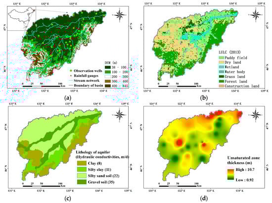 (a) Geographical locations of the observational wells and precipitation gauge stations used in this study; (b) Land use and land cover (LULC); (c) hydraulic conductivities; and (d) average unsaturated zone thickness in the Naoli River basin, Northeast China.