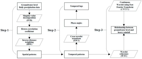 In addition, original signals of groundwater level and precipitation were decomposed and reconstructed via the continuous wavelet using fast Fourier transform (CWTFT) method, respectively. A more complete process of the methodology was described by Montejo []. Furthermore, a conceptual framework of research procedure was shown in Figure 2 to demonstrate the analytical design in this study.
