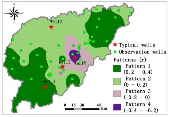 One major mode has been identified based on the SVD method, which explains 97.1% of the spatial relationship between the five-day groundwater level and precipitation across the Naoli River Basin during 2008–2013. Based on the heterocorrelation coefficient (r) of the major mode, the relationship between groundwater level and precipitation was divided into four spatial patterns in the entire basin (Figure 3). The spatial distribution of r represents the correlation between the expansion coefficient of groundwater level and precipitation in space.