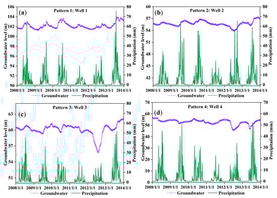 The typical wells were randomly selected in four pattern regions, and the meteorological stations closest to the typical wells were selected, respectively. The comparisons of the time series between groundwater levels and precipitation during 2008–2013 were shown for four patterns (Figure 4). The groundwater level dynamic is characterized by a periodic change of annual scale in four patterns. In pattern 1 (Figure 4a), the groundwater level is sensitive to changes in precipitation, which quickly increases as precipitation increases, and decreases as precipitation decreases. In pattern 2 (Figure 4b), the sensitivity of groundwater level to precipitation is delayed. When the precipitation occurs, the groundwater level rise will be delayed until after a certain period of time. In pattern 3 (Figure 4c), groundwater level shows a significantly declining trend during 2008–2012. When precipitation occurs, the level rises after a period of time. In pattern 4 (Figure 4d), the dynamic of the groundwater level is significantly delayed by that of precipitation. The groundwater level is in the trough during the wet period and the peak during the dry period of every year.