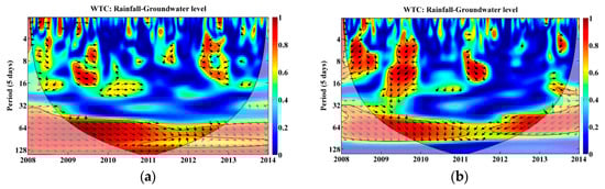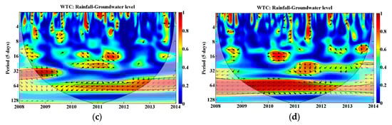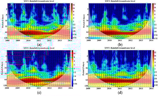 Except for the relevant time scales mentioned above, more local correlations between groundwater level and heavy rainfall was found based on the WTC method for the four patterns during 2008–2013 (Figure 6). The correlation with a 5% significance level was shown with a range of 0–10 (0 × 5–2 × 5) days in 2008, 40–80 (8 × 5–16 × 5) in 2009, and 15–80 (3 × 5–16 × 5) days in 2012 for pattern 1 (Figure 6a); a range of 20–60 (4 × 5–12 × 5) days in 2008, 20–120 (4 × 5–24 × 5) days in 2009, 30–80 (6 × 5–16 × 5) days in 2011, and 15–30 (3 × 5–6 × 5) days in 2013 for pattern 2 (Figure 6b); a range of 160–240 (32 × 5–48 × 5) days during 2008–2009, 0–25 (0 × 5–5 × 5) days in 2010, 70–90 (14 × 5–18 × 5) days in 2011, and 10–25 (2 × 5–5 × 5) days in 2013 for pattern 3 (Figure 6c); a range of 0–15 (0 × 5–3 × 5) days in 2008, 65–100 (13 × 5–20 × 5) days in 2010, 100–165 (20 × 5–35 × 5) days in 2011, and 50–70 (10 × 5–14 × 5) days in 2013 for t pattern 4 (Figure 6d). These features in the results may be explained by the responses of the groundwater level dynamics to heavy rainfalls.