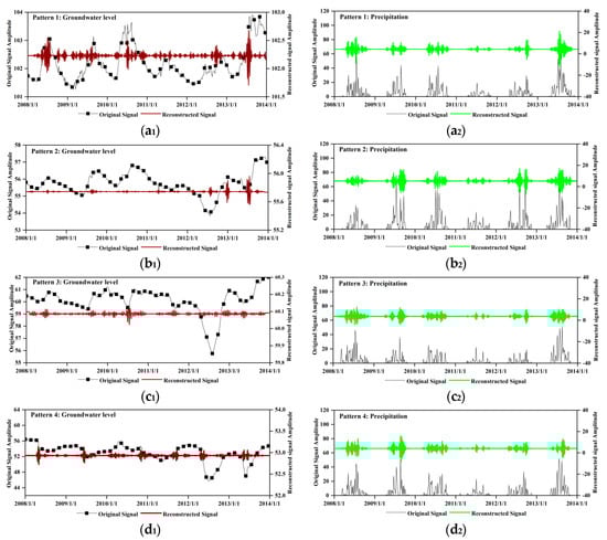 Reconstruction of original signals between groundwater level and precipitation in the Naoli River Basin, Northeast China, during 2008–2013, based on the continuous wavelet using fast Fourier transform (CWTFT) method for pattern 1 (a); pattern 2 (b); pattern 3 (c); and pattern 4 (d), respectively.