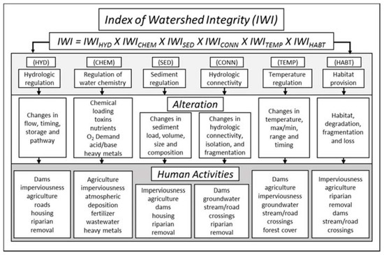 In a recent effort to integrate the assessment and management of aquatic ecosystems within watersheds, Flotemersch et al. [2] constructed an operational definition and approach for evaluating ‘watershed integrity’, which the authors describe as ‘the capacity of a watershed to support and maintain the full range of ecological processes and functions essential to the sustainability of biodiversity and of the watershed resources and services provided to society’. This definition of watershed integrity builds and expands upon a foundation of biological and ecological integrity studies that define integrity of an ecosystem within an environmental context that includes natural variation and disturbance regimes, as well as anthropogenic alterations and disturbances [17,18,19]. The ultimate factor affecting ecological integrity of aquatic ecosystems is human activity, and ecological integrity is inversely related to human impacts on ecosystems [20]. The major anthropogenic disturbances linked to the degradation of aquatic ecosystem integrity are associated with population growth, land use alterations, increases in impervious surfaces, agriculture, mining, oil and gas extraction, point and diffuse polluted runoff, riparian and instream channel modifications, water impoundment and extraction [21]. Within watersheds, river and stream ecosystems are exhibiting increasingly disturbed conditions associated with chemical pollution and physical habitat alterations, directly reducing the integrity and health of these aquatic ecosystems [22,23].