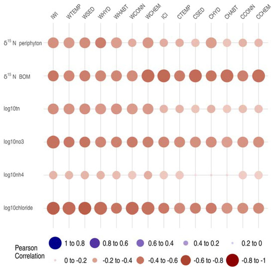 Another nitrogen-related response metric that demonstrated strong negative correlations with IWI and ICI values that can be compared across watersheds is the measured nitrogen-stable isotope ratios of chironomids (in CRW streams), periphyton (in NBW streams), and benthic organic matter (in NBW lakes). Again, the nitrogen sources varied (agricultural to urban), as well as the aquatic ecosystems (streams, lakes), and temporal scales (single summer-time sample event, repeated measures, seasonal, annual averages), yet 83% of the nitrogen-stable isotope ratio response measures revealed moderate to very strong negative correlations (r = 0.40–1.0) with IWI and ICI values. Stable isotope ratios of periphyton and stream macroinvertebrates (e.g., chironomids) have been shown to be effective indicators of watershed development effects on stream ecosystems [67,68]. This can also make them useful for quantifying the effectiveness of nitrogen, stream, and watershed management efforts [62]. The strong relationship between these nitrogen-stable isotope ratios and IWI and ICI values across watersheds demonstrates the integrative nature of the IWI.