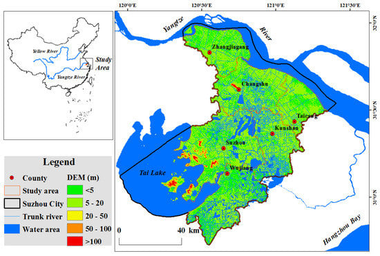 Suzhou City, located in Eastern China, is surrounded by the Yangtze River, Tai Lake, and Hangzhou Bay, and covers an area of 8639 km2. There are six counties under the jurisdiction of Suzhou City: Zhangjiagang, Changshu, Taicang, Kunshan, Suzhou, and Wujiang (Figure 1). Across Suzhou City, the landform is made up of plains, waters, and hills, accounting for 55%, 42%, and 3% of the study area, respectively. The highest elevation is 341.70 m above sea level, located on the eastern bank of Tai Lake, and the average elevation is 7.97 m above sea level. The climate type belongs to the subtropical monsoon climate with a multi-year average precipitation of 1100 mm. The rainy days and precipitation amount are mainly concentrated in the flood season, including plum rain (May to June) and typhoon rain (July to September), which account for 61% of the annual precipitation. Special topography and climate conditions have formed densely covered lakes and rivers and the region is typical with a river network plain. Based on materials in the 1960s and 2010s (waters of the Yangtze River and Tai Lake were excluded), the average river density was 3.85 km/km2 and 3.36 km/km2 and the average water surface ratio was 11.31% and 9.56%, respectively.
