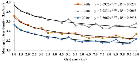 Mean grid river density of the study area in different grid sizes. Grid size increased from 1.0 km to 10.0 km in 0.5 km increments. The relationship between mean grid river density (GRD) and grid size was well fitted by the power function at each time.