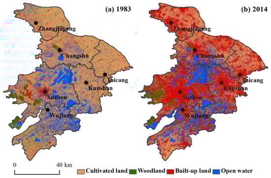 The proportion of built-up land increased from 10.12% to 41.55% between 1983 and 2014, while the proportion of cultivated land decreased from 62.05% to 31.56% (Table 2). The land urbanization level (i.e., built-up land proportion) is an important indicator to estimate the level of urbanization [36]. Han et al. [21] used this indicator to estimate the urbanization level of counties in the Yangtze River Delta and defined counties with a land urbanization level under 30% as a low urbanization level and over 40% as a high urbanization level. Therefore, Suzhou City experienced a sharp urbanization process between 1983 and 2014.