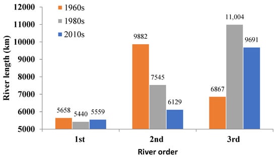 - The lower the order of the river, the larger was the variation in the accumulated length (including increase and decrease). River systems were transformed and disturbed more seriously during the agricultural modification period (1960s–1980s) than during the urbanization period (1980s–2010s), based on the variation in the accumulated length of the total rivers.