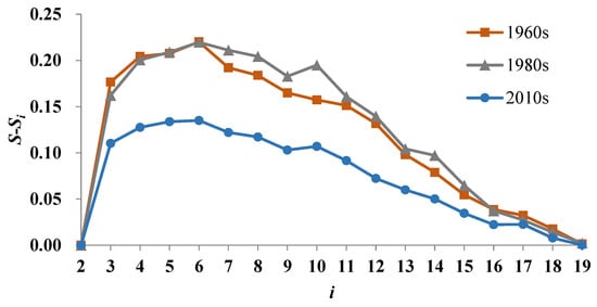 The length of the total rivers approximated 22,408 km by the 1960s but increased to 23,988 km by the 1980s and decreased to 21,379 km by the 2010s. Along with the time, the length of the first-order river firstly decreased slightly and then increased slightly while the length of the second-order river continued to fall substantially. However, the length of the third-order river firstly increased sharply and then decreased substantially (Figure 4). That is, agricultural modification (during the 1960s–1980s) was associated with a decrease in the length of the first-order river and second-order river but with an increase in the length of the third-order river; however, urbanization (during the 1980s–2010s) was associated with an increase in the length of the first-order river but with a decrease in the length of the second-order river and third-order river.