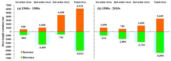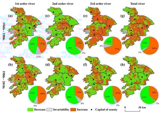 For the variation in river length at a 3 km × 3 km scale, the length of the first-order river varied within a narrow range in both periods; the massive decrease in length of the second-order river and the massive increase in length of the third-order river were remarkable characteristics during the 1960s–1980s. The lengths of the second-order and third-order river were all decreased during the 1980s–2010s, and the decrease in length of the third-order river was more than that of the second-order river (Figure 7). Moreover, the lower the order of the river, the larger was the variation in the accumulated length (including increase and decrease). In addition, the accumulated length variation of the total rivers during the 1960s–1980s was greater than during the 1980s–2010s, which indicates that the river systems were more seriously transformed and disturbed during the agricultural modification period than during the urbanization period.