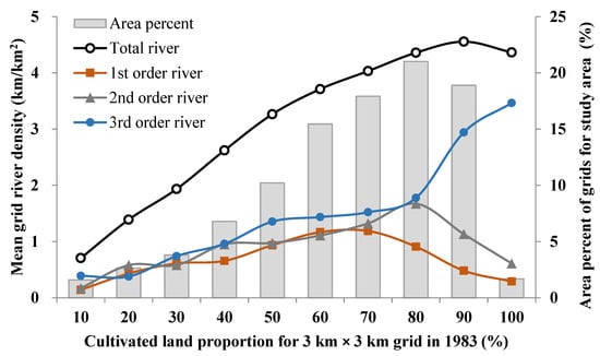 Figure 8 shows the relationship between the proportion of cultivated land and the corresponding mean GRD of the river system on a 3 km × 3 km scale in 1983. The mean GRD of the total rivers continued to increase until the proportion of cultivated land was 90%, and the increasing trend became slower as a whole. For different orders of rivers, the mean GRD firstly increased and then showed different change characteristics, i.e., the mean GRD of a first-order river and second-order river went down with a turning point at 70% and 80% cultivated land proportion, respectively, while the third-order river speeded up with a turning point at 80% cultivated land proportion. These results concur with those of Han et al. [21,34] who found that an increased river density was associated with agricultural water conservancy construction in the 1980s. Moreover, we speculate that undeveloped land was reclaimed to increase the amount of available arable land [25], but when the undeveloped land had been fully developed, the riverbanks were then reclaimed. In other words, when the proportion of cultivated land exceeded a threshold level, the higher order rivers were invaded, cut off, and even buried, which forced a part of the higher order rivers to transform into narrower rivers. However, in the agricultural areas of developed countries, rivers (including open ditches and channels) were replaced with subsurface drains [8] or were even buried [35] to provide more efficient access to the land. Therefore, the river system evolution varies from region to region under different agricultural modes.
