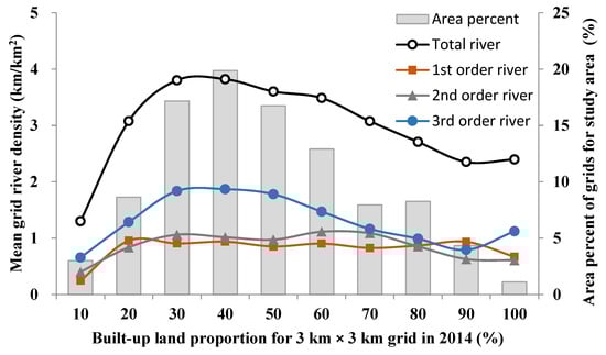 Previous researchers showed that urbanization has a profound impact on river systems, and most researchers have concentrated on correlations between river indicators and impermeable surface coverage in watersheds or districts [20]. Figure 9 shows the relationship between the proportion of built-up land and the corresponding mean GRD of river systems on a 3 km × 3 km scale in 2014. The mean GRD of a first-order river and second-order river increased until the proportion of built-up land was 20%, and then smoothly fluctuated and tended to weakly decrease with an overall increase in the proportion of built-up land. However, the mean GRD of a third-order river first sharply increased and then continuously decreased; the corresponding turning point was a 40% proportion of built-up land. Similar results have been found in previous studies. The larger rivers (or higher order rivers) were usually dredged and reconstructed to meet the needs of flood protection and drainage during low urbanization levels in the Hangzhou-Jiaxing-Huzhou Plain [26] and the Tai Lake Watershed [28]. Moreover, in heavily urbanized portions of the Gunpowder-Patapsco Watershed, larger rivers were protected from burial by prominent riparian zones and environmental legislation [12]. In contrast, smaller rivers (or lower order rivers) were more extensively buried than larger rivers [3] and the difference increased with increasing impervious surface coverage in the Chesapeake Bay Watershed [35] and the Nansi Lake Basin [12]. In addition, some smaller rivers were widened and changed into larger rivers to improve the abilities of storage and discharge [28].