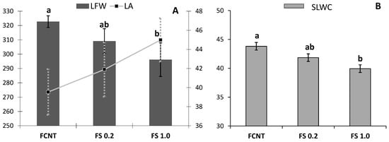 40]. In our test, the recorded reduction of LFW when the surfactant was added at the highest rate could be explained by the higher leaf expansion (i.e., increased LA, +13.3% at 1.0 mL