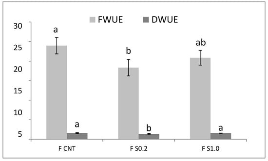 Figure 2. The FWUE of F CNT was significantly higher than that of F S0.2, but it did not differ from that of F S1.0; otherwise, the DWUE was the same in F CNT and F S1.0, and again the lowest under F S0.2 treatment.