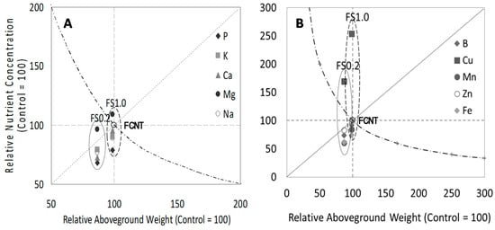 41]. The slight tendency for a reduction of FW recorded in F S0.2 could be related to a reduced nutrient availability, as showed in the vector analysis. In particular, the K, Ca, and Mg content of F S0.2 (under the isoline with respect to F CNT in