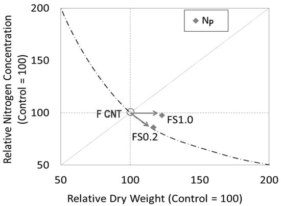 P content of lettuce leaves under F S0.2 and F S1.0 treatments was normalized to that of F CNT (control = 100) and then expressed in relation to the lettuce aboveground dry weight to emphasize the effect of the surfactant on fertigation. When MOS was added to the fertigation solution, the marketable lettuce showed a lower N relative to the unit weight under F S0.2, and an unchanged one under F S1.0, which indicates better nitrogen use efficiency in MOS-treated lettuce when compared to the F-CNT lettuce (