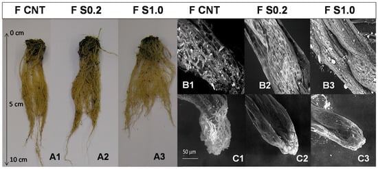 Figure 5(C2,C3)) in both the roots of F S0.2 and F S1.0 samples in comparison to the untreated control (
