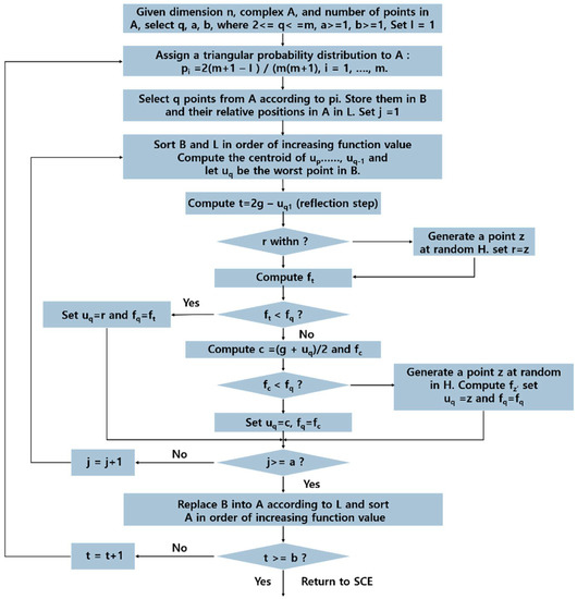 Proposed by Duan et al. [12], Shuffled Complex Evolution method developed at the University of Arizona (SCE-UA) is a global optimization procedure that combines complex shuffling with the advantages of existing search techniques such as the Simplex method [31,33], Controlled Random Search, and competitive evolution. SCE-UA effectively delivers information included in the population, and prevents the regression of such information. This characteristic makes it effective in searching for global optimal solutions in a wide range of problems [34] (Figure 4).