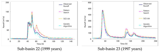 The selected rain storm events exhibited flood characteristics at all observation points in the Mihocheon stream basin and did not show extreme variation in flood runoff. Six rain storm events were selected for two sub-basins, namely Sub-basin 22 and Sub-basin 23, and calibration was performed on a total of four events that occurred between 1997 and 2003. Rain storm events dating back to 2004 and 2006 were used for validation. Table 1 shows the rain storm event data and period, while Figure 8 presents the flood runoff hydrographs of the rain storm events. Parameter calibration was performed using seven watershed parameters (SMI, BII, S-SS, Ts, Tss, n1, n2) and three channel parameters (KTS, n, n1′) of each channel.