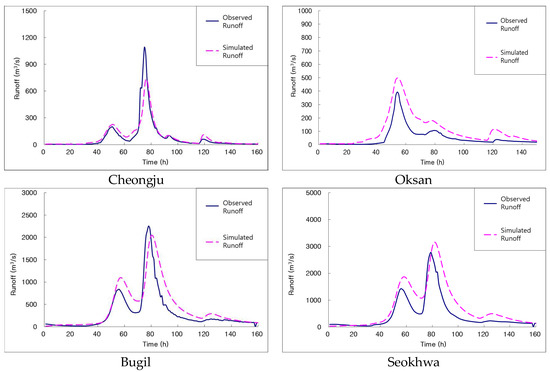 The graph of Figure 13 is the result of applying representative parameters to water stage observation stations in the basin. For the rain storm event, the results obtained at the Seokhwa water stage station was highly ideal, indicating that the representative parameters can be realistically applied to enhance the accuracy of flood forecasting and warning in the Mihocheon stream basin.