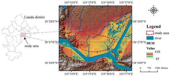 Map showing the general location of the study area (left) and the digital elevation model map displaying specific details of the study area (right).