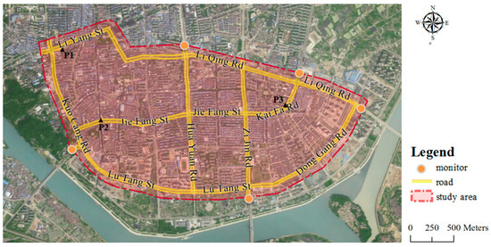 Remote sensing image of the study area showing the main road network and locations of five traffic flow monitors (P1, P2, and P3 indicate three locations of serious flooding).