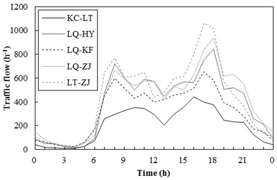 From Figure 9a, it is obvious that congestion on the weekday is more serious than on the weekend, especially in the morning. The level of congestion in both situations fluctuates within a certain range in the afternoon. For example, the traffic volumes at 14:00, 15:00, 16:00, 20:00, and 21:00 on the weekend were higher than during the same periods on weekdays. This finding is shown in Figure 9b, as the intersection of Li Qing Road and Hua Yuan Road is one of the main transport hubs in the entire system; it has an important role in concentrating and diffusing traffic. Consequently, the traffic volume at this junction from 09:00 to 22:00 remained high with little variation.