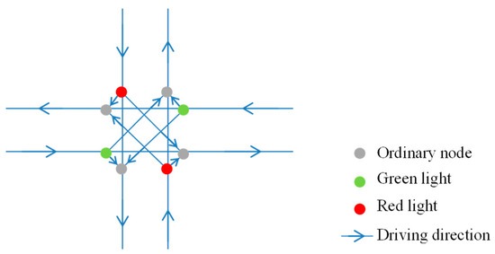 Modeled junction structure at a crossroads. The direction of each unidirectional road is represented by an arrow. The colored nodes change color to reflect the condition of the traffic lights.