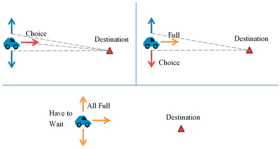 The main motivation of the traffic model implemented in this study was the destination of each driver. Before arriving at a junction, a driver chooses the direction they will follow next. In most cases, drivers choose the direction that takes them closer to their destination based on perceptual experience. However, if the desired road is already completely full, the driver has to make a decision: choose the next most preferred road or wait at the junction if no other options are available. In reality, the choice of direction is not absolute because of uncertainty, which means it is difficult to simulate accurately. Therefore, to simplify the model, our study ignored this problem. Figure 6 shows the three conditions regarding direction selection at a junction.
